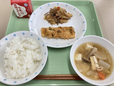 菜の花ごはん、あじのさんが焼き、蓮根のきんぴら、みそけんちん汁、牛乳