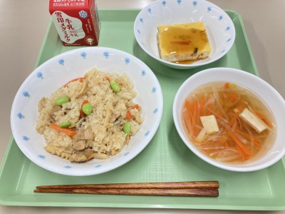 五目おこわ、ぎせい豆腐、すまし汁、牛乳