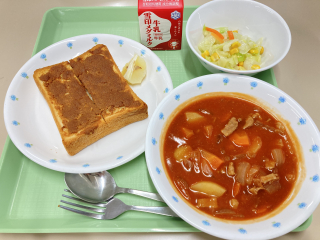 きな粉トースト、ビーンズトマトシチュー、キャベツとコーンのサラダ、日向夏、牛乳