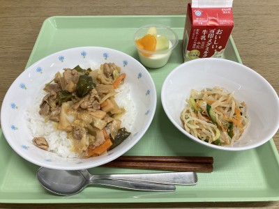 回鍋肉丼、中華サラダ、杏仁豆腐、牛乳